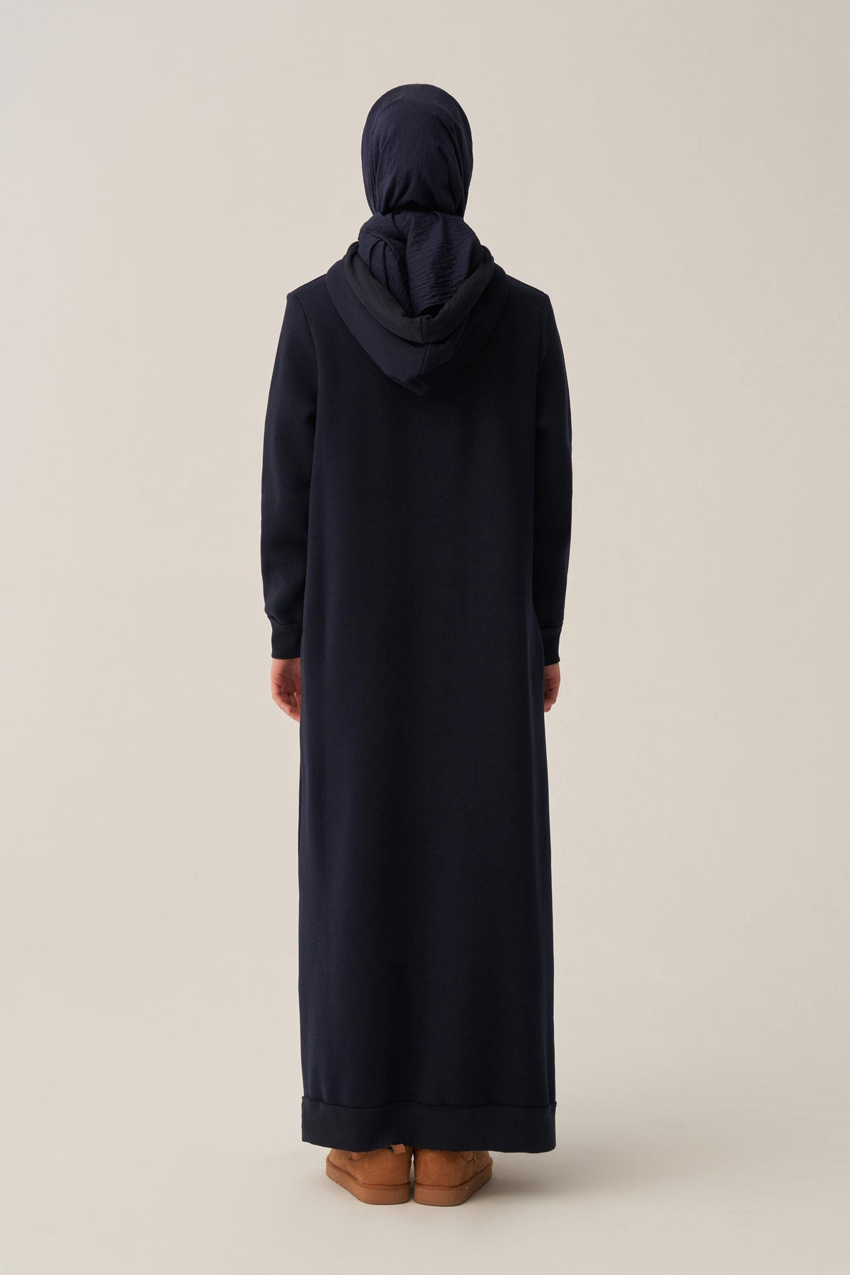 This hooded long dress is designed for everyday comfort with a refined, modern look. Crafted with a cotton outer surface, it offers a smooth, breathable feel, while the soft fleece inner lining provides warmth and cozy insulation, making it ideal for cooler seasons. The relaxed straight silhouette ensures ease of movement, while the adjustable drawstring hood adds both function and style.