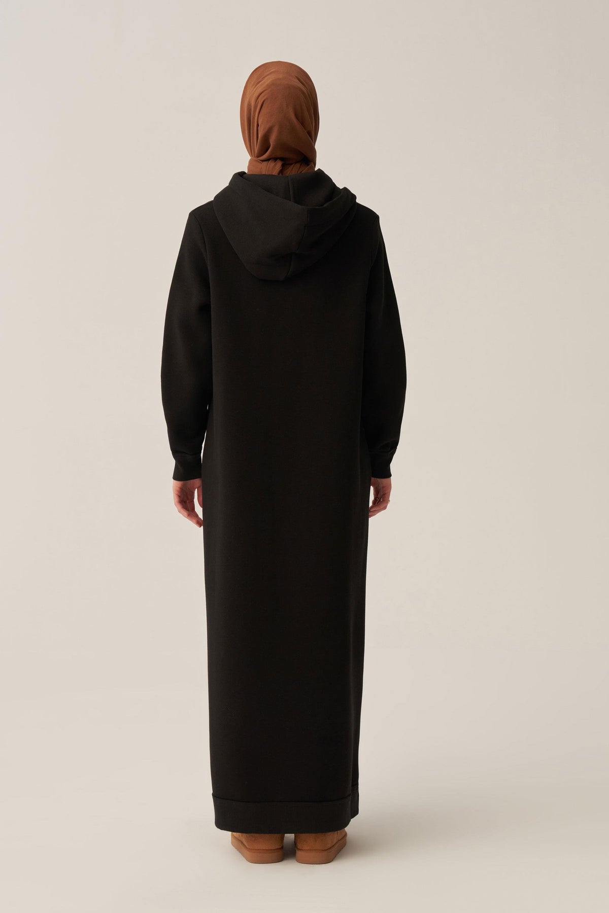 This hooded long dress is designed for everyday comfort with a refined, modern look. Crafted with a cotton outer surface, it offers a smooth, breathable feel, while the soft fleece inner lining provides warmth and cozy insulation, making it ideal for cooler seasons. The relaxed straight silhouette ensures ease of movement, while the adjustable drawstring hood adds both function and style.